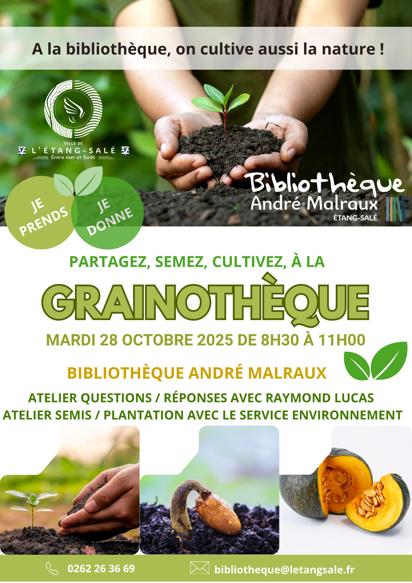 📢 À partir du mardi 28 octobre 2025, la bibliothèque André Malraux vous invite à découvrir la grainothèque. 🌾 Une grainothèque, qu'est-ce que c'est ? Installée sous la forme d’un meuble en libre-service, la grainothèque repose sur le principe du troc. Elle permet à chacun d’échanger librement des graines de légumes, de fruits, d’arbres ou de fleurs entre jardiniers amateurs. ✅ L’objectif ? Favoriser le partage, la biodiversité et le lien entre les habitants autour de gestes simples : partager, semer, cultiver. 📍 Pour vous faire découvrir ce nouvel espace, la bibliothèque organise une matinée d’animation : 🗓️ Rendez-vous mardi 28 octobre 2025 – de 8h30 à 11h00 📍 Bibliothèque André Malraux – L'Étang-Salé ➡ Atelier semis et plantation avec le Service Environnement 💬 Atelier questions/réponses avec Raymond Lucas 👉 Plus d'information au 0262 26 36 69 ou à bibliotheque@letangsale.fr